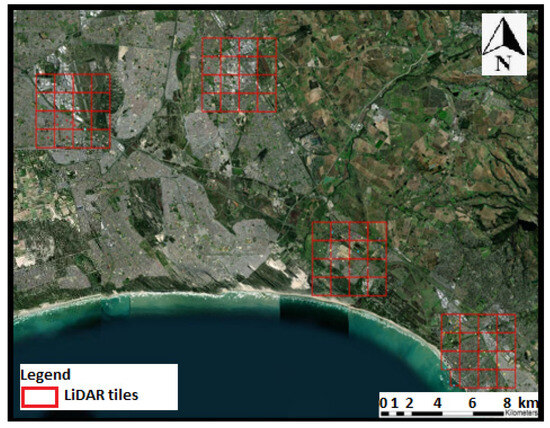 From the limited LiDAR coverage, four square areas of 4 km by 4 km, each containing 16 LiDAR tiles, were sampled as shown in Figure 4. The selection of adjacent tiles within each block allows for classification of an integrated environment large enough to encompass multiple local climate zones. Using the 2 m LiDAR point cloud data, a digital surface model (DSM) was generated by subtracting the elevation from the digital elevation model (DEM) created from ground-tagged points of the same dataset. This resulting raster layer was added to the classification stack along with spectral indices, necessitating the creation of a new training set for this classification.