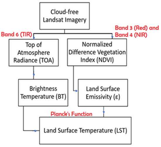 This inversion of Planck’s function is based on a mathematical combination of compound parameters calculated based on the individual bands from the Landsat image product and was performed on the Google Earth Engine (GEE). This is due to the capacity of the GEE to handle the downloading of raw data, pre-processing, processing, and extraction all in one interface without additional data. The input parameters include the Normalised Difference Vegetation Index (NDVI), Top of Atmosphere (TOA) Radiance, brightness temperature (BT/Tsen) emissivity of the land surface, Vegetation and Soil, Vegetation Fraction, and Cavity Effect [38], Figure 5; Table 1. The outcome of this algorithm is an estimate of the LST value for each 30 m-by-30 m Landsat pixel to produce a surface temperature map for each sampled image.