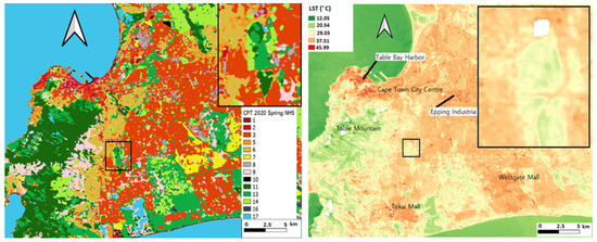 Cape Town spring LCZ map with 5-pixel neighbourhood function (NH) (left), spring LST map extracted from Landsat 8 (OLI-TIRS) (right), and full set of LCZ and LST images is in Appendix A and Appendix B.