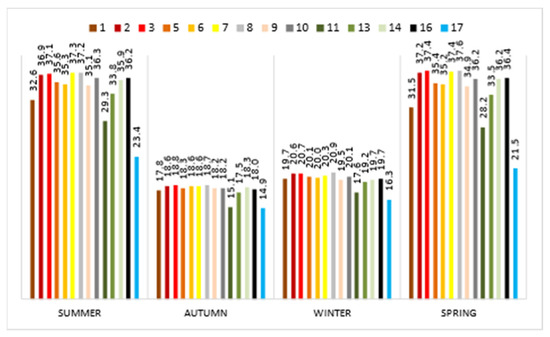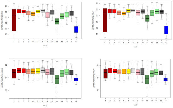 The results from the bar graphs used to visualise the LST means revealed similarities across certain LCZs, despite their belonging to different classes (Figure 7). Notably, LCZ 8 (large open) consistently exhibited the highest mean LST values across all seasons, with its highest mean being at 37.2 °C in the summer, followed closely by LCZ 7 (lightweight) and LCZ 2 and 3 (compact mid- and low-rise, respectively). During the warmer seasons of spring and summer, LCZ 3 is always warmer than LCZ 2; however, the difference between their means is extremely small across all seasons. LCZ 2 has higher buildings and is thus more shaded. As such, while the two LCZs are comparable in density and composition, the shaded patches of LCZ 2 would result in overall lower LSTs. While the difference between LCZ 2 and 3 is small, they are both significantly larger in mean LST than LCZ 1 with a difference of 4 °C in the summer and 5 °C in the spring. These are all LCZ within the compact parent cluster only separated by building height. While it can be argued that the low LST experienced in LCZ 1 (compact high-rise) is due to shading by tall buildings, the difference of 4–5 °C is larger than the 1–2 °C found in a previous study which had more LCZ 1 representation and thus better classification accuracy [67]. In this study, LCZ 1 (compact low-rise) was the least represented and least well classified LCZ, suggesting that the large observed differences could be bias propagated from the sampling. Throughout the seasons, LCZs characterised by homogeneous natural features, such as LCZ 17 (water) and vegetated LCZs 11 (A and B) have the lowest temperatures. However, the temperature gap between the hottest LCZ (large open/8) and the coolest (LCZ 17) is wider in the spring and summer (14 °C) than it is in the autumn and winter (4 °C).