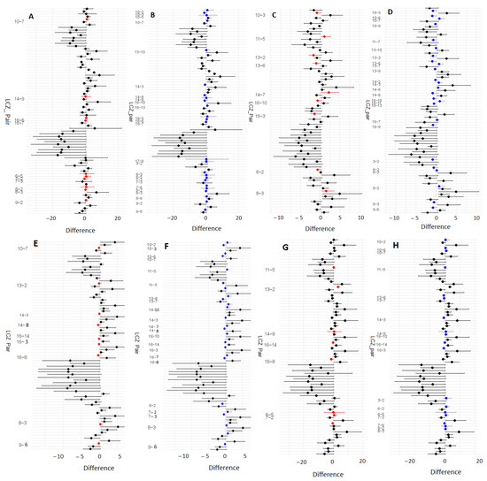 Tukey HDS test plots showing pairs whose LST differences are not statistically significant (Red) and or practically significant (Blue) for spring (A,B), winter (C,D), autumn (E,F), and summer (G,H).
