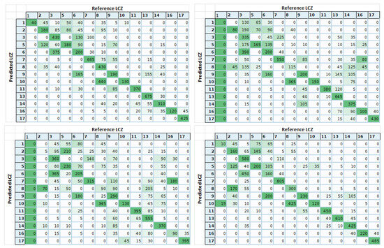 Distinct natural LCZ, such as LCZ 17 (G/water) are clearly differentiated from all the other LCZs with differences ranging from 2 °C when paired with LCZ 5 (open mid-rise) in the winter which is only 20% of the fraction of the value it takes when compared to the same LCZ in the spring (11 °C). The densely vegetated LCZ 11 (A–B) is also quite well differentiated across all seasons, with the smallest difference in the spring being 3 °C when compared with LCZ 5 and the higher end being 10 °C when compared with large open (LCZ 8). All the pairs that show differences that are not statistically significant (red, Figure 9) or those that might be statistically significant but not practically significant (blue, Figure 9) can be categorised into three groups: (i) those within the same parent cluster (open/compact) separated only by building height (e.g., LCZ 6 and 5 with a difference of 0.18 °C in the spring and 0.29 °C in the summer), (ii) those in different clusters but with shared similarities in feature density, composition, or configuration (e.g., LCZ 8 and 3 in the spring with a difference of 0.05 °C, LCZ 7 (lightweight) and 10 (industrial) in the winter and summer with differences of −0.73 °C and −0.93 °C, respectively, LCZ 7 and 6 in the spring, with a difference of 0.43 °C, LCZ 9 and 6, with a difference of −0.34 °C, and LCZ 9 and 14), and (iii) those with patterns that defy explanation without further investigation into other possible LST drivers, such as LCZ 16, whose thermal environment seems to not be significantly different from most other LCZs. This is most visible in the summer Tukey plot where the LST difference between LCZ 16 and 8 and LCZ 16 and 14 are both not statistically significant, as well as with LCZ 16 as compared to LCZ 10 and 3, which proves to be statistically significant but not practically significant (Figure 9). Some of the pairs whose differences in thermal environments are neither statistical nor practically significant are reflected in the LCZ classification confusion matrices (Figure 10). This implies a similarity in spectral properties between these pairs.