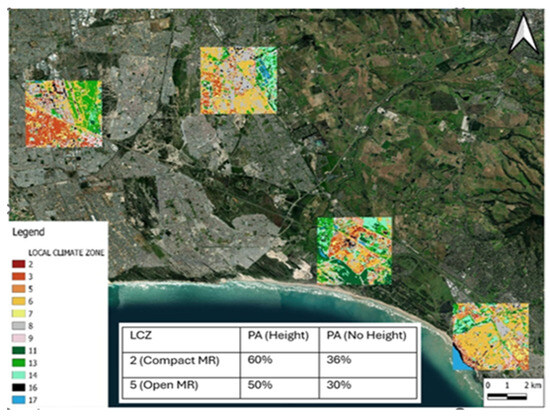 The spring image LCZ classification with height yielded a Kappa coefficient that was a 9% improvement on the classification without height. The producer’s accuracy (PA) over the high classes (LCZ 2 and LCZ 5) is considerably higher with height than without. According to this PA, there is a 60% probability that any spot chosen at random belonging to LCZ 2 on land is correctly classified on the heighted map as compared to the 36% of the un-heighted map, and similarly 50% versus 30% for LCZ 5 (Figure 11). The inclusion of height in the data stack does not only result in a better overall classification of the mid-rise classes but also less confusion with the low-rise classes.