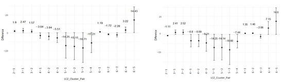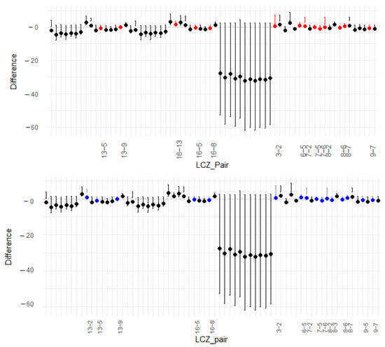 Another round of Tukey’s HSD based on the heighted Spring 2020 image revealed that the difference between LCZ 3 and 2 has increased from 0.2 °C to 0.65 °C, which means the improved classification has improved their distinction in thermal environment; however, it is still not a practically significant difference (Figure 12). The individual LCZs within the open cluster (LCZ 5 and 6) also have an increased LST mean difference, from 0.18 °C to 0.84 °C, which is still not practically significant as they both fall below the 1 °C threshold. This suggests that while building height improves the surface thermal environment distinction of LCZs within each parent cluster, it is not enough to make them practically distinct. Moreso, the confusions that are observed with the un-heighted Tukey HSD between LCZs that share physical characteristics and those within each of the two-building height-dependent parent clusters are also observed in the heighted Tukey HSD. Both LCZ 3 and 2 are not distinct in thermal environments when compared with LCZ 8, with which they share imperviousness with LST differences of 0.08 °C and −0.56 °C, respectively. Similarly, LCZ 5 is still not thermally distinct from LCZ 7 at −0.05 °C. This suggests that the creation of distinct surface thermal environments rests on parameters that are more applicable across the entire LCZ spectrum than only building height, which is only restricted to the two parent clusters. As with the expected, there is also the unexpected, such as the confusion between LCZ 13 and 2 and also 13 and 5 at 0.80 °C and −0.86 °C, respectively. These are classes that do not have physical characteristics in common.