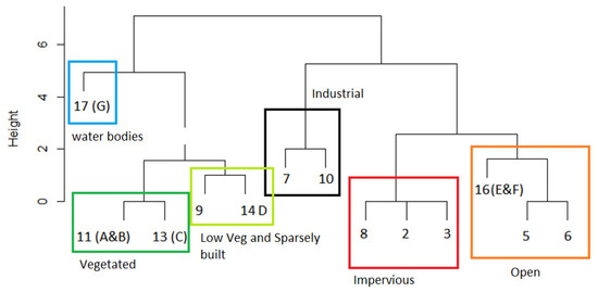 The second level of the dendrogram pairs together LCZs which were also observed to have similar thermal properties from the Tukey HSD. The algorithm separated the industrial looking LCZs (7 and 10) into their own cluster and separated them from the other mostly impervious LCZs (3 and 2). The highly vegetated (LCZ 11 and 13) LCZs were grouped together, and the sparsely vegetated (LCZ 9 and 14) were grouped together. However, LCZ 17 (G/water) was taken as its own cluster at level one. Local climate zone 16 was also taken to be its own cluster at level one. However, due to the repeated confusion of LCZ 16 observed both spectrally and thermally with the open clusters (LCZ 5 and 6), we interpreted LCZ 16 at level three where the algorithm combined it with the open cluster. Notably, the agglomerative algorithm at the top of the dendrogram has one cluster made of the built LCZ classes while the other cluster is made of the natural classes and LCZ 9. During the ground truthing work, LCZ 9 (sparsely built) and 14 (low plants) were most observed to be quite similar in appearance. What this suggests is that the semi-automated process captures the nuances of physical similarities observed in the field and has an advantage in the ability to be interpreted at different levels with relevance to the objective of the study.