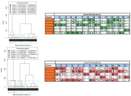 Having shown that the improvement in the classification that results from the inclusion of building height in the classification protocol does not solve the problem of lack of distinct thermal environments between groups that are within the same parent cluster (compact/open), we employed a semi-automated, as well as a fully automated, statistical clustering method to cluster the LCZ into groups. The semi-automated method clustered LCZs based on similarity between physical characteristics of composition (vegetation/impervious/water/material) according to a density scale of “none”, “low”,” medium”, and” high”. The automated statistical method used a total of 26 indices to determine the maximum number of clusters based on natural patterns in the LST data and assigned each observation point to a cluster.