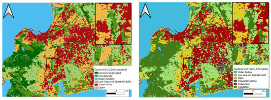 The observations in local climate zones application, particularly in the African context, has been that while the general appearance of a LCZ is given in the framework, the local urban form introduces some variations in that universal appearance. In a previous study of LCZ adaptation, [45] discovered that there were differences in how the same LCZ appears across different urban areas. While this difference is not large enough to push the LCZ into an altogether difference class, it is enough to shift around physical characteristics of density, composition and, to some extent, configuration. As such, a choice of a semi-automated clustering that allows for these nuances to be incorporated into the optimising process for each urban area makes this approach transferable. Meanwhile, adding a fully automated clustering algorithm that works based solely on data structures makes this approach robust in that is it not solely based on physical characteristics of each LCZ but also the internal data structures in the LST.