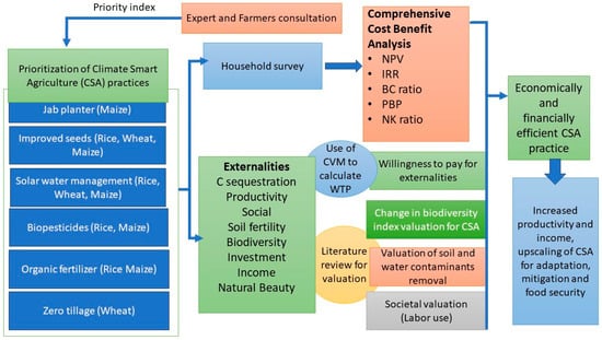 In this light, this research aims to determine the major costs and benefits of adopting chosen CSA practices; carry out a profitability assessment of practices using net present value, payback period, IRR, B/C ratio and NK ratio; determine the value of social and environmental externalities created by the CSA practices; and include the estimated value of those externalities in the cost–benefit analysis of the different CSA practices in major cereal crops. This study focuses on evaluating six CSA practices that smallholder farmers in the Gandaki River Basin of Nepal consider to have the most substantial impact on food security, productivity, and mitigation. As farmers bear the investment costs and directly experience the economic benefits of adopting CSA practices, the analysis presented in this paper adopts a farmer-centric viewpoint rather than a public one. The primary objectives of this paper include