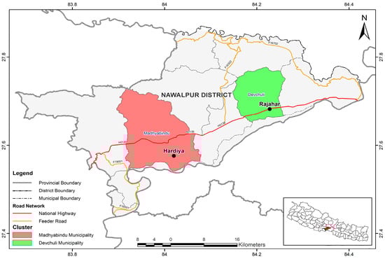 In Nepal, CSA practices have been implemented in selected villages from different ecological zones of the Gandaki River Basin with the support of the Consultative Group for International Agriculture Research (CGIAR) and coordination with different partners []. The pilot study is being carried out in six districts: Bardiya, Dang, Rupandehi, Nawlapur (formerly Nawalparasi), Gorkha, and Mahottari. These selected villages are vulnerable to changing climate and its impacts []. For our study, we have chosen the Nawalpur district (Figure 2).