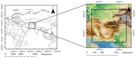 Dust storms are frequent in Central Asia, particularly during the spring and summer months [29]. The study area for this research included several countries in Central and South Asia, including Afghanistan, Iran, Pakistan, Tajikistan, Turkmenistan, and Uzbekistan (Figure 1). These regions are characterized by arid areas and several deserts, making them vulnerable to dust storms. Dust storms frequently occur in these regions and significantly impact agriculture and transportation [30], interfere with everyday operations, and present risks to human health [31]. The reason for choosing this specific study region is mainly related to the dust-source areas, which are mostly composed of dried-up lakes, like the Aral Sea and the Hamouns in Sistan, and the deserts that are located in eastern Pakistan.