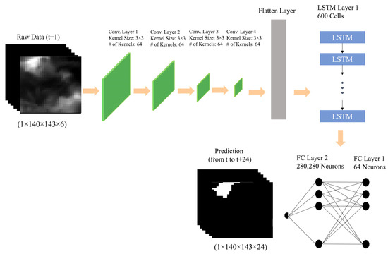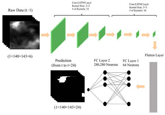 In this study, six ConvLSTM layers were used—the first three layers had 64 filters and the following three layers had 32 filters. Finally, two fully connected layers were used for prediction by analyzing the extracted features. The final cascaded architecture of the ConvLSTM model is illustrated in Figure 3.