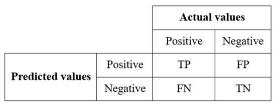 The performances of the proposed models were evaluated using the recall, precision, overall accuracy, Kappa coefficient, and F1 score. Figure 4 represents a confusion matrix used for deriving these metrics. A true positive (TP) refers to a positive outcome predicted by the model accurately, while a true negative (TN) signifies the accurate prediction of a negative outcome by the model. False positives (FPs) are positive outcomes incorrectly predicted by the model, and false negatives (FNs) are negative outcomes incorrectly predicted by the model.