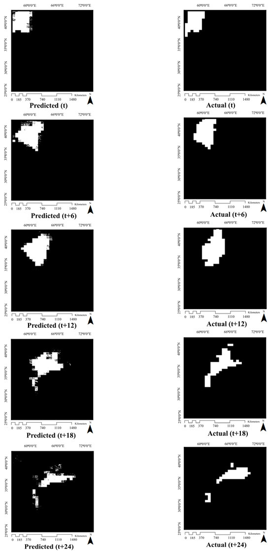 The predicted and actual shapes of a sample dust storm originating from Turkmenistan at t, t + 6, t + 12, t + 18, and t + 24 are shown in Figure 6. These results were obtained by using the ConvLSTM method and by including contextual information.