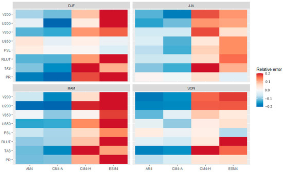 Figure 2 shows a diagram illustrating the relative errors of the models for various variables, including precipitation, temperature at 2 m (TAS), OLR, SLP, and zonal (U) and meridional (V) wind at high (200 hPa) and low (850 hPa) levels. The relative errors are interpreted as follows: a value of +0.20 indicates that a model’s RMSE is 20% higher than the median error across all models, while a value of –0.20 indicates that the error is 20% smaller than the median error [28]. As expected, the atmospheric models outperformed those with the ocean module activated, supporting the hypothesis that errors of the ocean model compound with those in the atmospheric model, thereby amplifying the overall error [41,42]. However, there are some exceptions, particularly in SLP and low-level zonal wind, where the ESM4 performs better during DJF. Among the models with the ocean module active, CM4-H exhibits lower relative errors than ESM4 across most variables, except for temperature at 2 m. Since both models are used in future climate projections, the choice between them depends on the specific variable of interest, temperature or precipitation.