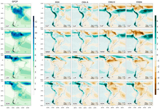 The double ITCZ pattern, which is erroneously simulated by most models [48,49], is notably absent in the NOAA/GFDL models (Figure 3). This suggests that the NOAA/GFDL models are more effective at capturing the processes related to energy flow, momentum exchange between the ocean and atmosphere, and tropical convection. The ITCZ is simulated in a more southerly position in both the CM4-H and ESM4 models. The position of the SACZ is accurately represented across all models; however, precipitation is generally overestimated. During MAM and JJA, the most significant discrepancies occur in tropical regions, which experience the highest precipitation levels during these seasons.