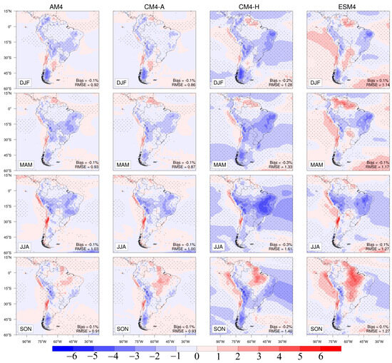 The performance of NOAA/GFDL models aligns with broader findings from CMIP6 analyses, particularly regarding their ability to capture key climatic features of South America. Similar to other CMIP6 models, the NOAA/GFDL configurations successfully simulate large-scale features such as the SACZ and the Bolivian High [50,61]. However, biases in precipitation and temperature are consistent with challenges observed in many CMIP6 models, such as the overestimation of precipitation over the Andes and underestimation in the Amazon region [51].
