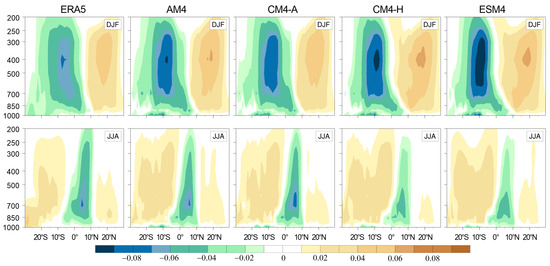 Zonal mean (80° W–40° W) vertical velocity (Pa/s) for austral summer (DJF) and winter (JJA) from ERA5 and NOAA/GFDL models.
