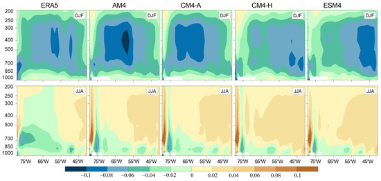 Figure 6 shows the zonal mean vertical velocity for the austral summer and winter over northern South America (80° W–40° W) to assess the Hadley circulation as simulated by the NOAA/GFDL models. The observed pattern indicates that the ascending branch in the Southern Hemisphere during DJF is more extensive than the ascending cell in the Northern Hemisphere, a feature linked to the inter-hemispheric energy distribution. Overall, the models successfully simulated the positions of the ascending and descending branches in both hemispheres and seasons. However, the models, particularly the coupled ones, exhibited a more intense upward movement in DJF than observed, which directly influenced the simulated precipitation over the Tropical Atlantic related to the ITCZ. Conversely, during the austral winter, the models simulated a weaker upward movement compared to the ERA5 data. Notably, the ESM4 model showed the largest discrepancies from ERA5, especially in simulating a more intense upward movement during DJF, leading to significant differences in precipitation over the tropical region.