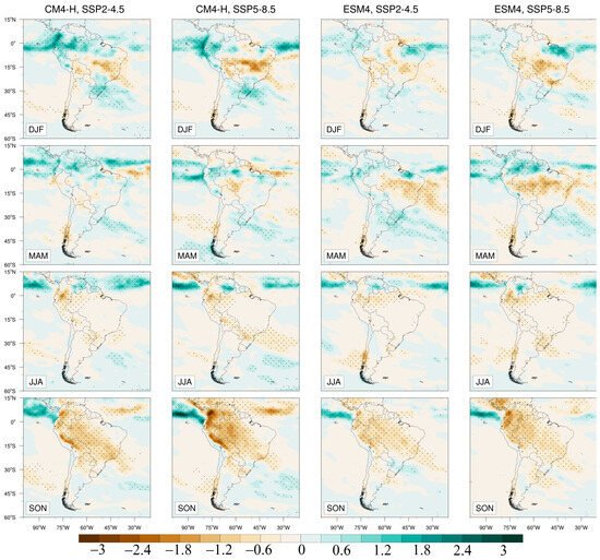 Seasonal precipitation differences between historical runs and future projections (Figure 8) reveal that the CM4-H model predicts more substantial changes in precipitation patterns than the ESM4 model, especially under SSP5-8.5. The most significant reductions in precipitation occur during the austral spring (SON) and summer (DJF) seasons, indicating potential substantial alterations in the South American Monsoon System, which could profoundly affect water resources, agriculture, and ecosystems. The SSP5-8.5 scenario consistently projects greater reductions in precipitation than SSP2-4.5, especially over critical areas such as the Amazon and Northeast Brazil, suggesting that higher emission scenarios may lead to more severe drying trends.