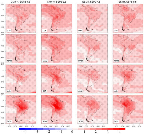 Figure 9 shows that both the CM4-H and ESM4 models project significant warming across South America under future scenarios, with the CM4-H model generally predicting slightly more intense warming, especially under the SSP5-8.5 scenario. The SSP5-8.5 scenario consistently results in higher temperature increases compared to SSP2-4.5, with the most significant warming observed in the Amazon, central Brazil, and southern South America. This suggests that higher emission scenarios could lead to more extreme temperature increases [55]. Additionally, the most significant warming is projected during the austral spring (SON) and summer (DJF). The warming in these seasons could lead to more extreme heat events and exacerbate the impacts of droughts and heat waves. This aligns with the greater radiative forcing in the SSP5-8.5 scenario (Table 2) and suggests that the CM4-H model may be more sensitive to changes in greenhouse gas concentrations.
