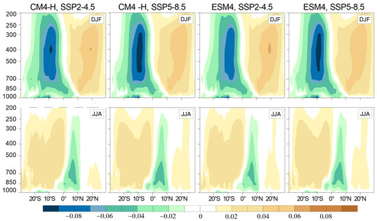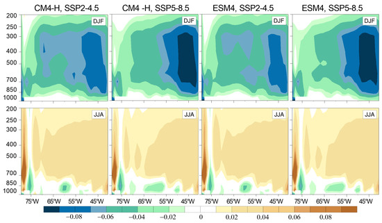 Zonal mean (80° W–40° W) vertical velocity (Pa/s) for austral summer (DJF) and winter (JJA) from CM4-H and ESM4 models for the future period (2030–2060) under SSP2-4.5 and SSP5-8.5 scenarios.