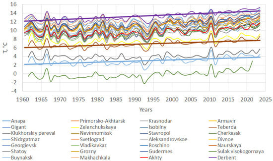 Figure 2). The values of Pearson’s correlation coefficients between the average annual NSAT at separate weather stations for the period 1960–2023 were significant (r > 0.9).