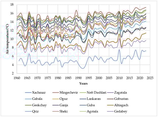Table 2 presents the geographic coordinates and primary temperature data for the Azerbaijani meteorological stations included in this study. From 1960 to 2023, average annual NSAT ranged from 3.1 to 17.4 °C across the various stations, with interannual standard deviations of 0.7–1.4 °C.