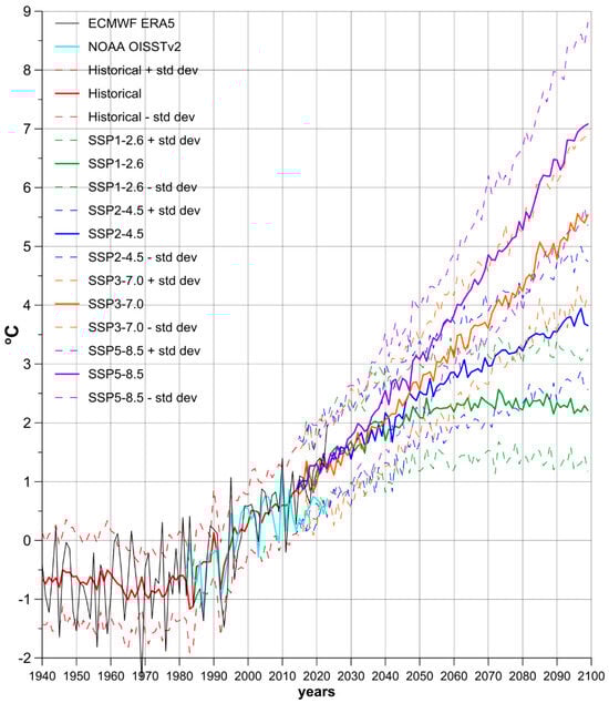 Figure 4 presents the average values (solid lines) and variability range (dashed lines) of annual NSAT anomalies in the study region for scenarios SSP1-2.6, SSP2-4.5, SSP3-7.0, and SSP5-8.5 from the 33 CMIP6 ESM ensemble for 2015–2099. Variability boundaries were defined as the ensemble average NSAT for a given scenario plus (upper boundary) and minus (lower boundary) one standard deviation of the annual NSAT anomalies from these 33 CMIP6 ESMs. All SSP scenarios examined project a warming trend in NSAT, both when averaged across the ensemble and in individual ESMs. As anticipated, the rate of warming accelerates with increasing CO