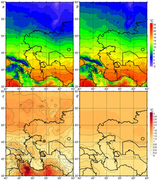 Figure 5c). However, the ESMs simulations did not capture some fine-scale spatial details, especially within the mountainous areas of the southern part of the study area, due to the models’ limited spatial resolution. Notably, the 33 CMIP6 ESM ensemble reproduced greater warming changes in the northern Caspian Sea region (more than 1.4 °C) compared to the central, including over the water (about 1.2 °C) (