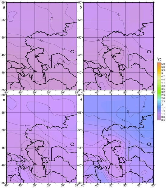 Figure 8). These simulations indicate that the average NSAT across the Caspian region is likely to rise by approximately 1.1–1.8 °C over the next 30 years. The northern portion of the study area is projected to experience an NSAT increase exceeding 1.3 °C, while regions over the Caspian Sea are projected to warm by approximately 1.1–1.3 °C. Importantly, we found no significant differences in projected near-term NSAT changes across the different SSP scenarios.