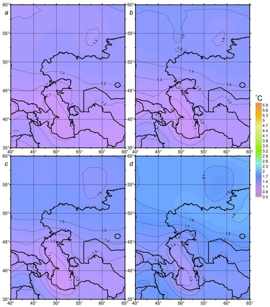 Figure 5). Over the period under study, the increase in NSAT was more pronounced in the northern (by ~1.6 °C) than in the central part of the Caspian region (
