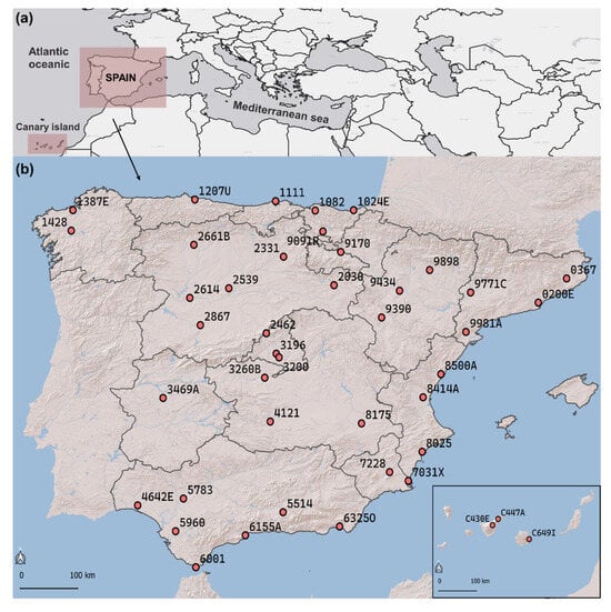 We used 43 meteorological observatories from the primary network of AEMET (Spain’s State Meteorological Agency), obtained from the European Climate Assessment and Dataset (ECA&D) database [57] (Figure 1). Stations were selected to span the full analysis period 1950–2024 with ≥80% original (non-missing) observations, enabling rigorous quality control (QC) and subsequent homogenization procedures. The observatories are approximately distributed uniformly across the Iberian Peninsula to represent drought behaviour in Spain’s principal geographic regions. No Balearic Islands stations were included because no series meeting the 1950–2024 requirement are available (Table 1).