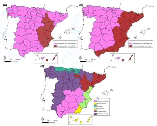 The Canary Islands alternate affiliations in the first two periods (western archipelago with the Atlantic-western mainland; eastern archipelago with the Mediterranean type). By 1991–2020, the partition becomes more articulated, with six distinct regions. In this latter period, Almería groups with the Canary Islands (which re-emerge as their own type), and a broad western-linked region consolidates, encompassing Galicia, the Northern Plateau, Huesca, central Iberia, Cáceres, and Huelva (Figure 3).