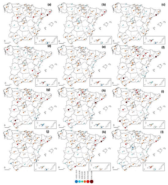 The evolution over the last few decades of the months with the most extreme SPEI-24 indices reflects a substantial increase, particularly in the observatories located in the northern half of the peninsula. Although it is true that there are no substantial monthly and seasonal differences, the NE of the peninsula is noteworthy, where several of its observatories (such as Girona or Lleida) record an increase in more than 0.14 months (decade) (Figure 10). Meanwhile, the most modest increases are found in Cantabria, Canary Islands, and the Mediterranean regions. Some observatories, such as that of San Sebastián (Igueldo), even record slight decreases in the number of months. Other observatories, such as the Mediterranean coasts (Castellón, Valencia or San Javier), also record slight decreases that are not statistically significant (−0.06 to −0.02 months/decade). Station-level monthly values are provided in the Supplementary Materials (Tables S6–S7).
