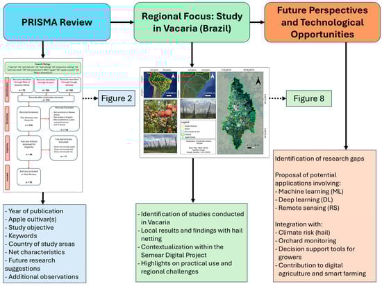 Flowchart of the study illustrating the three main stages. The first stage involved a systematic review using the PRISMA methodology. The second focused on an analysis of existing studies conducted in Vacaria (Brazil), a region included in the Semear Digital Project. The third stage explored future perspectives, highlighting potential applications of AI (including machine learning and deep learning) and remote sensing technologies in the context of hail netting in apple orchards.
