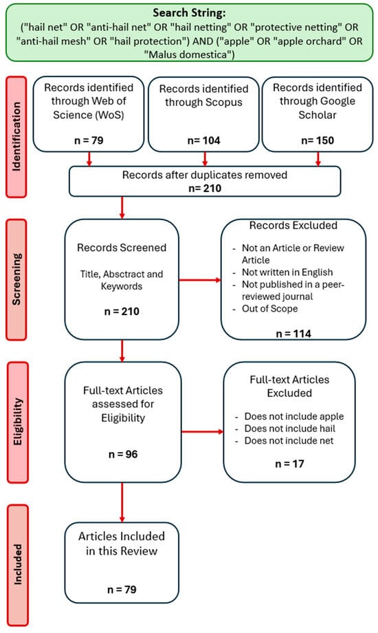 This review followed the PRISMA guidelines [17,18,19] and was based on a structured literature search conducted in three databases: Web of Science (WoS), Scopus, and Google Scholar. The following search string was used in all platforms: (“hail net” OR “anti-hail net” OR “hail netting” OR “protective netting” OR “anti-hail mesh” OR “hail protection”) AND (“apple” OR “apple orchard” OR “Malus domestica”). The review was conducted in July 2025 and included studies from all available years, without imposing any temporal restrictions.
