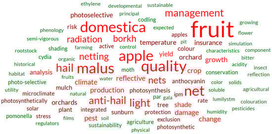 To highlight the main topics explored in the reviewed studies, a word cloud was created using the keywords provided by the authors. As shown in Figure 3, the size of each term is proportional to its frequency in the dataset. Notably, terms such as Malus domestica, management, antihail, fruit, apple, light, and net were the most frequent. These results reinforce the central role of hail netting in apple orchard management and its impact on fruit quality and environmental conditions within the production system.