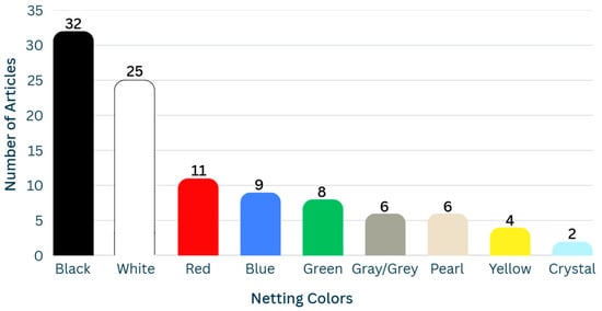 Figure 5 displays the number of articles associated with each netting color. The most frequent colors were black and white, followed by red, blue, and green. Less common colors included gray, pearl, yellow, and crystal. Studies comparing multiple net colors aimed to assess their effects on variables like fruit quality, vegetative growth, and pest management.