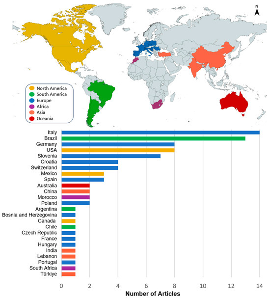 Figure 6 presents the 25 countries in descending order by the number of articles identified. Among them, nine countries stood out as the most frequent study locations: Italy, Brazil, Germany, United States of America (USA), Slovenia, Croatia, Switzerland, Mexico, and Spain, respectively. In contrast, the remaining 16 countries were represented by only one or two articles each, suggesting more limited, but still relevant, research activity in those regions.