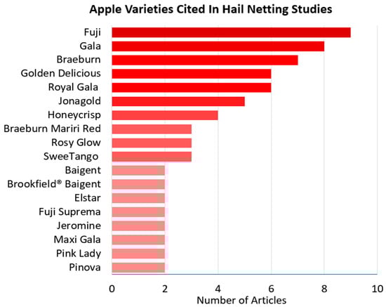 Frequency of apple varieties studied under hail netting systems. The horizontal bar chart shows the number of articles analyzing each variety, ranked from most to least frequent. The color gradient from dark red (top) to light red (bottom) reflects the decreasing number of studies per variety. Fuji, Gala, and Royal Gala emerged as the most frequently studied varieties.