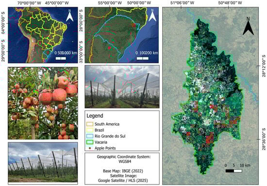 Figure 8 shows the location of Vacaria, along with examples of field photos collected in March 2025 using the Agrotag app [57]. During this fieldwork, a total of 105 apple-related points were collected throughout the municipality. Each point included georeferenced coordinates, a photo of the orchard, and specific information regarding the presence or absence of hail netting.