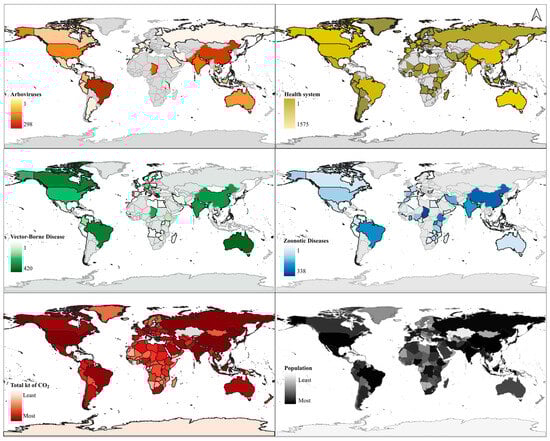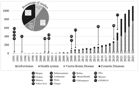 There has been an exponential growth in studies on health related to climate change over more than three decades (Figure 1). The first study relating climate change to dengue, cholera, malaria, and yellow fever was in 1991 [26,27]. The first study relating schistosomiasis to climate change was recorded in 1995 [28], in 2001 on leishmania [29], and in 2002 on Ebola and Chagas disease [30,31]. The first study on mental health was recorded in 2008 [32], addressing the Kyoto Protocol. In the same year, a study was conducted on rabies [33]. Diseases such as Chikungunya [34], Zika [35], Mayaro [36], and COVID-19 [37] addressed the climate issue in the years 2009, 2015, 2019, and 2020, respectively. In addition, the countries with the highest CO2 emissions have the largest population, and countries in the tropical region have more records of studies on arboviruses, health systems, vector-borne diseases, and zoonotic diseases (Figure 2).