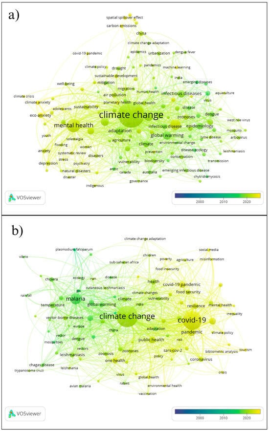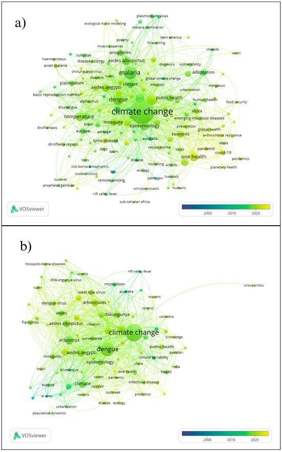 Author keywords based on the searched word groups, excluding “climate change” and “one health”. (a) Vector-borne disease and (b) Arboviruses.