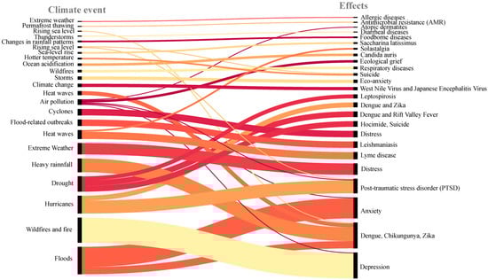 Undoubtedly, climate events, whether through indirect or direct drivers, cause effects that are often irreversible to most of the human population (Figure 5, Table 1, and Supplementary Material see Table S1). This study found climate events such as heat waves, drought, flood-related outbreaks, thunderstorms, ocean acidification, changes in rainfall patterns, wildfires, permafrost thawing, sea-level rise, hurricanes, wildfires, and air pollution, among others, affect not only physical but also mental health.