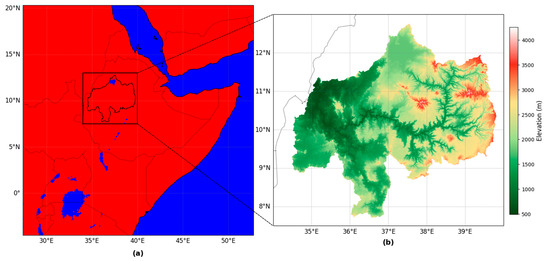 The weather pattern of the Upper Blue Nile Basin (UBNB) is mainly controlled by large-scale atmospheric patterns, which are responsible for the moisture transportation from the surrounding oceans and water bodies [1]. The transported moist air masses are dominated by a convergence zone in low-pressure systems, accompanied by the Intertropical Convergence Zone (ITCZ), which extends from West Africa across the north of the basin [2]. The main rainfall season (June–September (JJAS)) contributes around 70% to the annual rainfall over the UBNB, which is on average 1200 mm [3]. The JJAS weather pattern is influenced by the northward migration of the ITCZ, the strengthening of the tropical easterly jet, and the moist southwesterly monsoon flow originating from the Atlantic Ocean and the Congo basin [1,4]. During this season, the low-level East African jet and mid-level African easterly jet play critical roles in transporting moisture into Ethiopia [5]. The low-level East African jet enhances the moisture transport from the Indian Ocean across northern Ethiopia, increasing the JJAS rainfall [4,6]. The mid-level African Easterly Jet influences the development of African Easterly Waves, enhancing the convective activity and rainfall [7,8]. In addition, the mechanism of the North Atlantic Subtropical High (the Azores High) also controls low-level westerly flows and moisture advection toward northeastern Africa, affecting the JJAS rainfall over the Ethiopian Highlands [9].