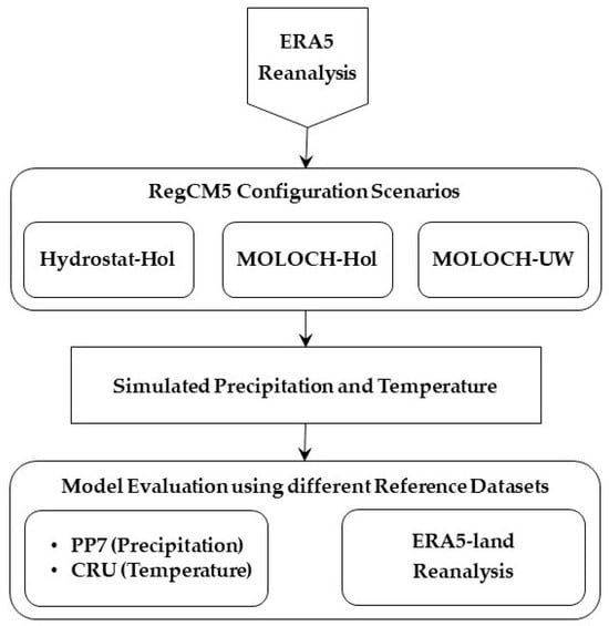 Framework diagram for the evaluation of the different RegCM5 configuration scenarios.