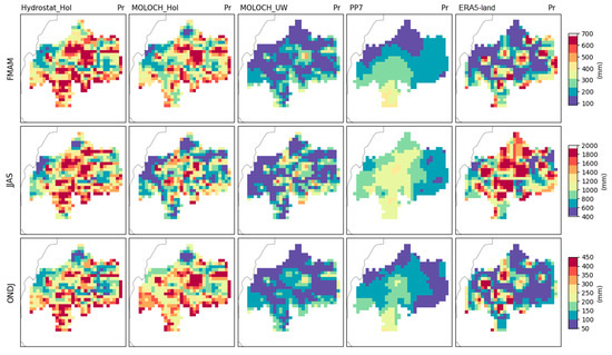Seasonal mean precipitation over the UBNB for (FMAM, JJAS, and ONDJ) at (upper, middle, and lower) rows.