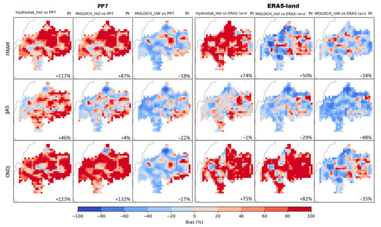 Seasonal mean precipitation percent bias (Bias%) with respect to the PP7 and ERA5-land data over the UBNB during the three seasons (FMAM, JJAS, and ONDJ) at (upper, middle, and lower) rows.