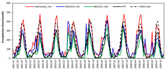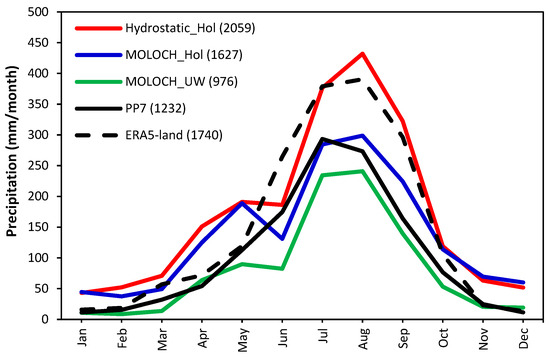 Figure 5 shows the mean monthly precipitation of simulated scenarios compared to the reference datasets (PP7 and ERA5-land) over the analysis period (2001–2009). The mean annual of the PP7 and ERA5-land equals 1232 mm and 1740 mm, respectively, where the ERA5-land overestimates the PP7 main wet season (JJAS). The hydrostatic scenario succeeds in capturing the ERA5-land pattern during JJAS, although a relative underestimation/overestimation in the JJAS onset/peak (Aug.). It is also highly overestimated compared to the PP7; however, it captures the JJAS onset of the PP7. This overestimation by the ERA5-land is similarly found by [60], exhibiting the poorest performance when assessed, among other reference datasets, by comparing with ground-based rainfall data over the UBNB. Ref. [60] concluded that the rainfall products with in-situ data gauge assimilation provide more accurate estimates than the reanalysis-based data, especially over a complex terrain basin like the UBNB. MOLOCH succeeds in reducing overestimation to be closer to PP7, especially during JJAS, but the short rain and dry seasons (FMAM and ONDJ) are still overestimated compared to PP7 and ERA5-land. Generally, both MOLOCH scenarios struggle to capture the JJAS onset. Finally, the UW succeeds in fixing the whole rainfall pattern except for a relative underestimation in JJAS compared to observations (PP7), showing that it is the most optimal scenario in reproducing the seasonal cycle of the precipitation over the UBNB.