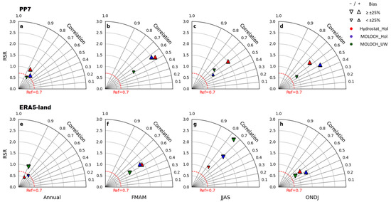 Constructed Taylor-style diagrams of Annual, FMAM, JJAS, and ONDJ precipitation with respect to the PP7 (a,b,c,d, respectively) and ERA5-land (e,f,g,h, respectively).